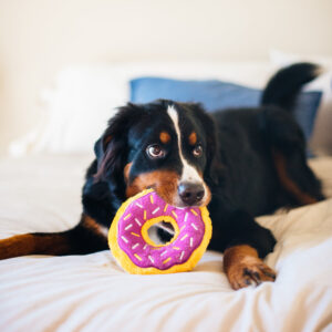 Of special consideration are no-stuffing toys. We created no-stuffing toys like our popular Donutz because some dogs have a tendency to chew into toys to get at the stuffing inside. These toys are meant to fully engage and interest your dog without feeding into their desire to pull out stuffing. And depending on your dog’s play preferences, these types of toys could last longer than other toys that do have stuffing.